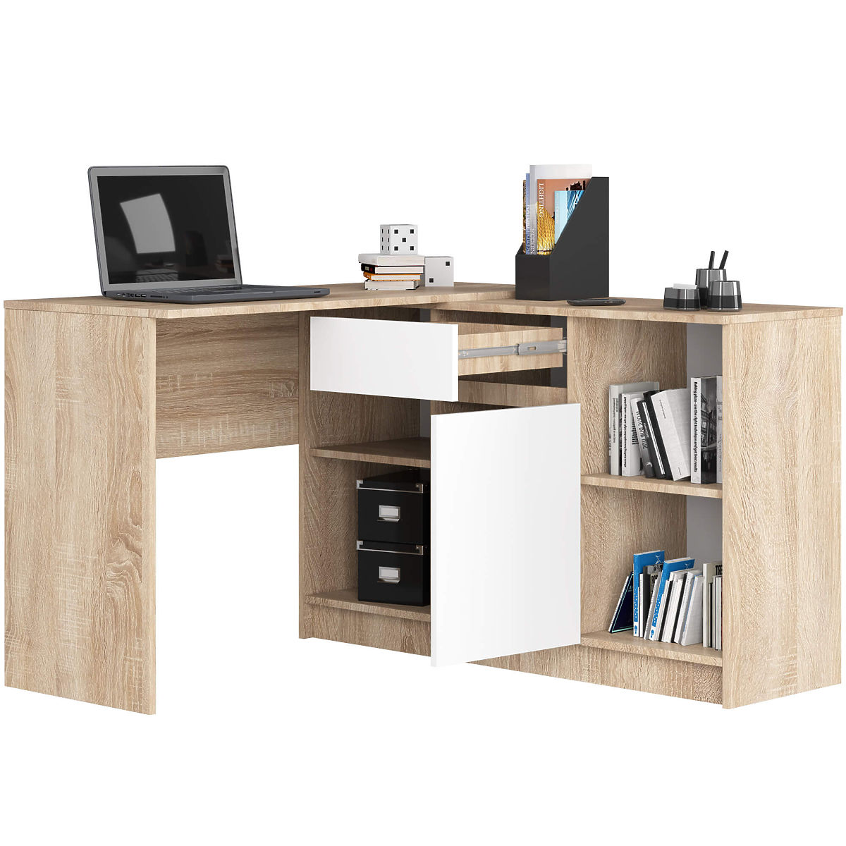 Set B-17 komoda i radni stol iznimno je funkcionalan. Njegova konstrukcija omogućuje montažu s desne ili lijeve strane. Zahvaljujući tome, može se prilagoditi prostoru koji imate na raspolaganju. Set će biti prikladan za ured, uključujući kućni, ili studentsku sobu. Spajanje stola i komode u cjelinu omogućuje bolje iskorištavanje prostora. Police mogu primiti fascikle, uredski i pisaći pribor ili knjige. Tu je i ladica za sitne predmete. Zahvaljujući tome, sve potrebno tijekom rada ili studija bit će nadohvat ruke.