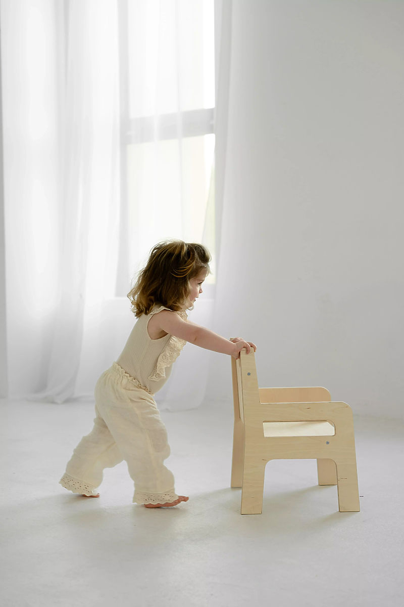 Drvena dječja stolica je osmišljena za djecu različite dobi – poslužit će kako jednogodišnjem djetetu koje otkriva svijet, tako i starijem, kreativnom predškolcu. Pruža čvrstu potporu leđima i istovremeno osigurava udobno sjedenje tijekom igre, crtanja ili objedovanja. Odlično se koristi i u kuhinji ili kupaonici – dijete može stati na sjedište i lako dosegnuti radnu površinu ili umivaonik. Svi rubovi su pažljivo zaobljeni kako bi se osigurala maksimalna sigurnost malih korisnika.