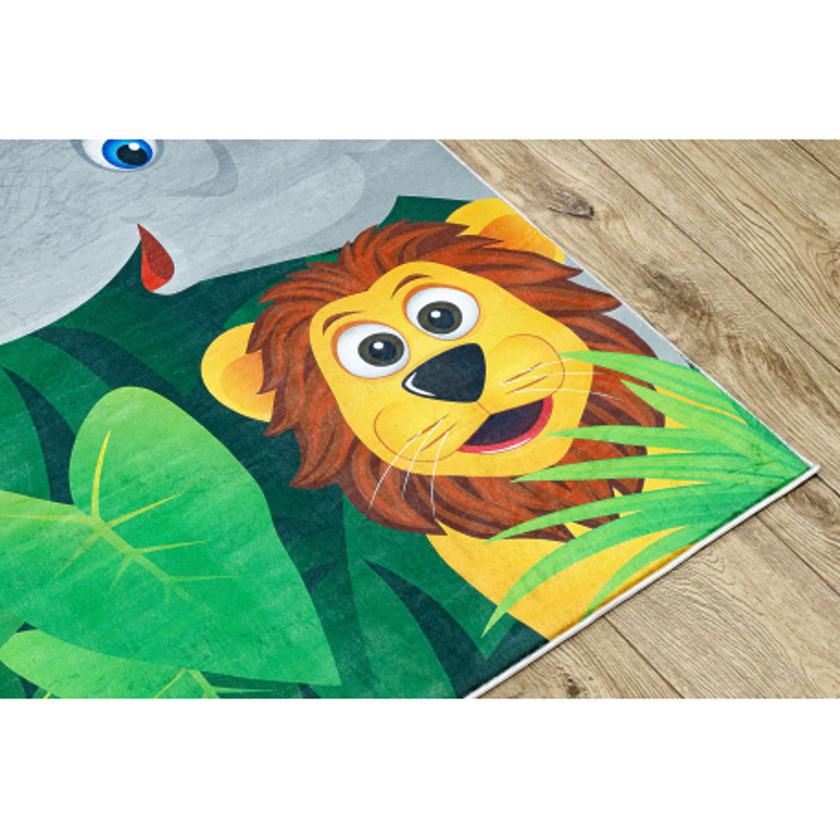 Otkrijte svijet pun avantura s dječjim tepihom za pranje BAMBINO 2705, koji donosi motiv afričkih životinja u ugodnoj zeleno-smeđoj kombinaciji boja. Ovaj tepih uljepšava svaku dječju sobu i stvara okruženje koje potiče maštu, igru i učenje. Slonovi, lavovi, žirafe i drugi životinjski prijatelji prate vaše dijete tijekom svakodnevnih aktivnosti i pretvaraju običan prostor u razigrani safari. Tepih je izrađen od 100% poliestera, što osigurava mekanu i ugodnu površinu koja je istovremeno izdržljiva i jednostavna za održavanje. Debljina od 5 mm pruža udobnost pri sjedenju i igri, dok lagana konstrukcija omogućuje jednostavno rukovanje. Velika prednost je mogućnost pranja u perilici rublja – zahvaljujući tome tepih je uvijek čist i higijenski. Protuklizni donji sloj sprječava klizanje i osigurava sigurnost pri kretanju djece.