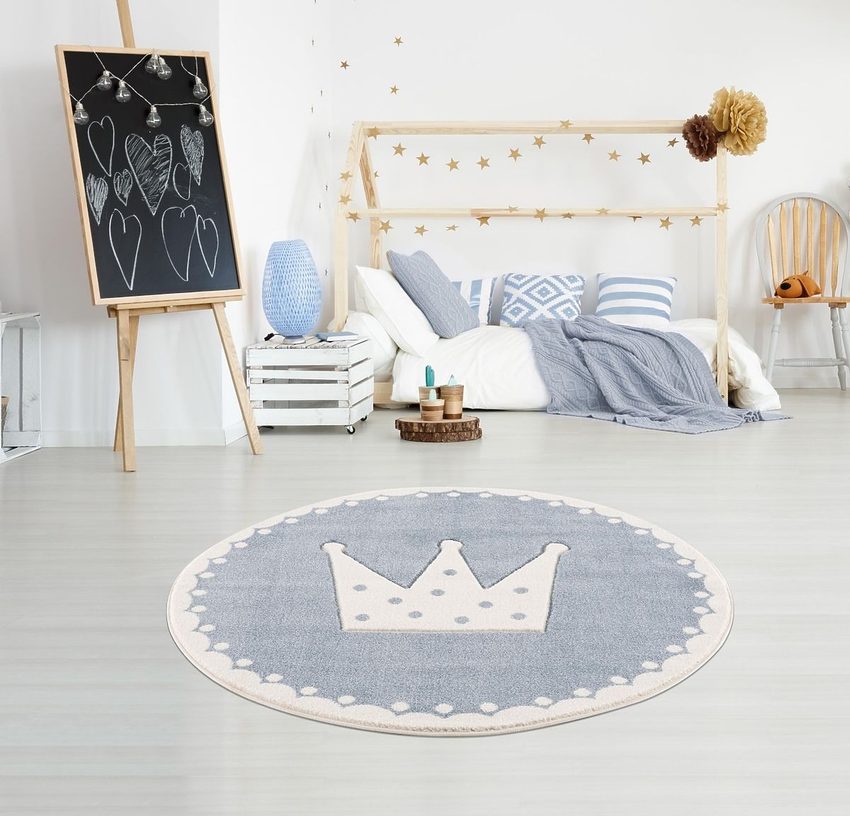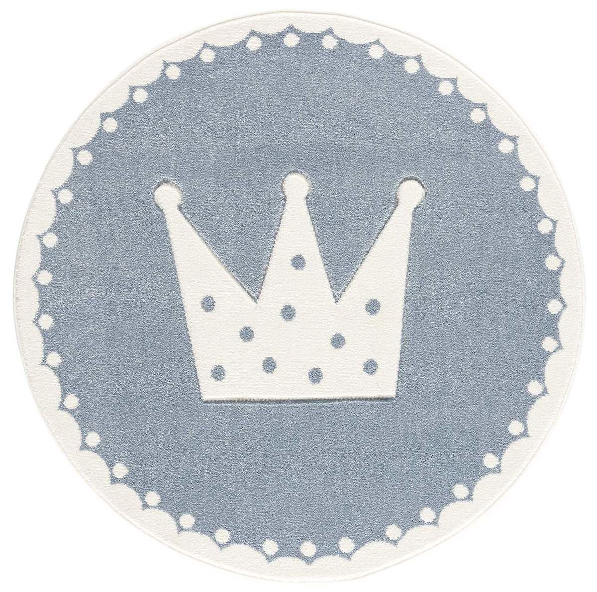 Luxusní kulatý modro-bílý koberec s korunou od německé společnosti LIVONE do dětského pokoje.