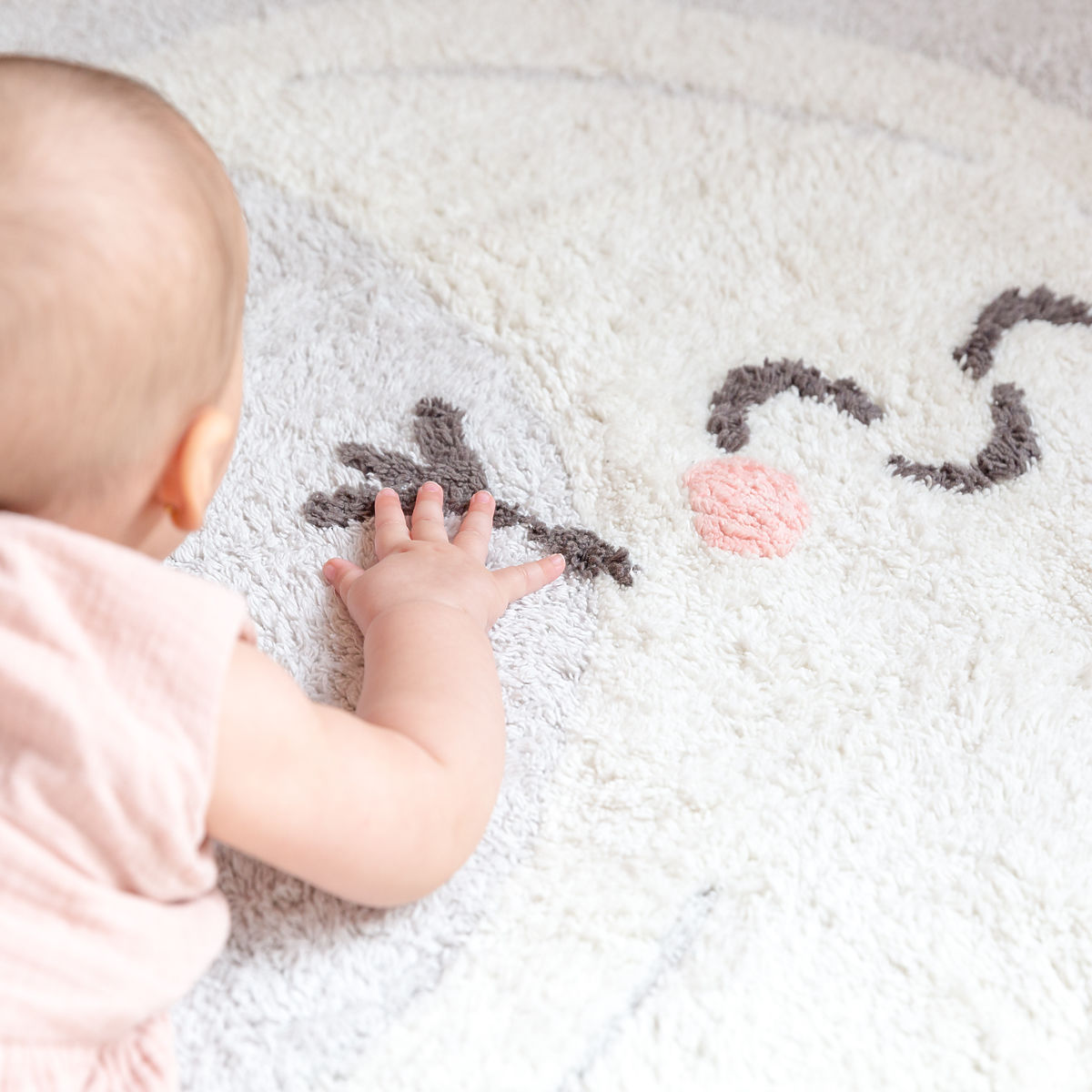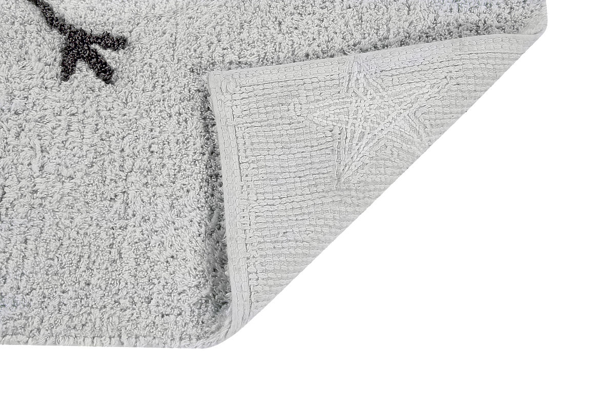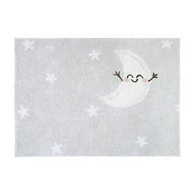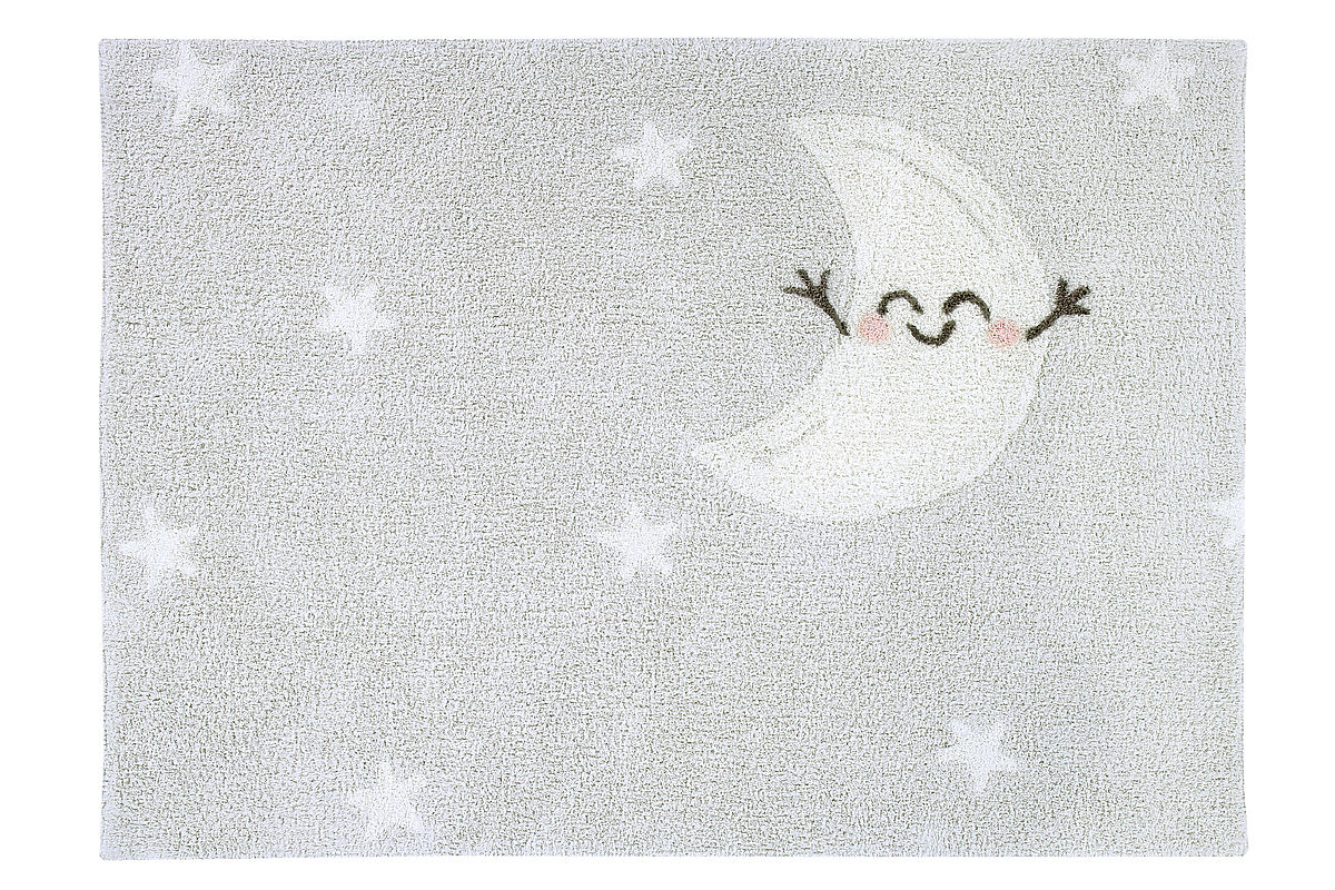 Ručně tkaný luxusní šedý koberec s motivem měsíce a hvězdiček, španělské firmy Lorena Canals, do dětského pokoje je nejen krásný a hebký, ale taky velmi praktický - chrání dítě před studenou podlahou a lze jej prát v pračce.