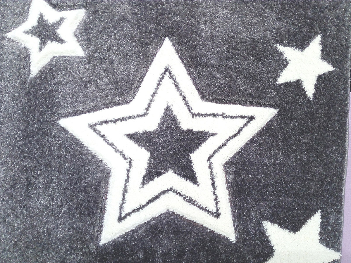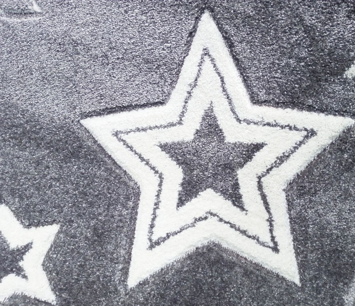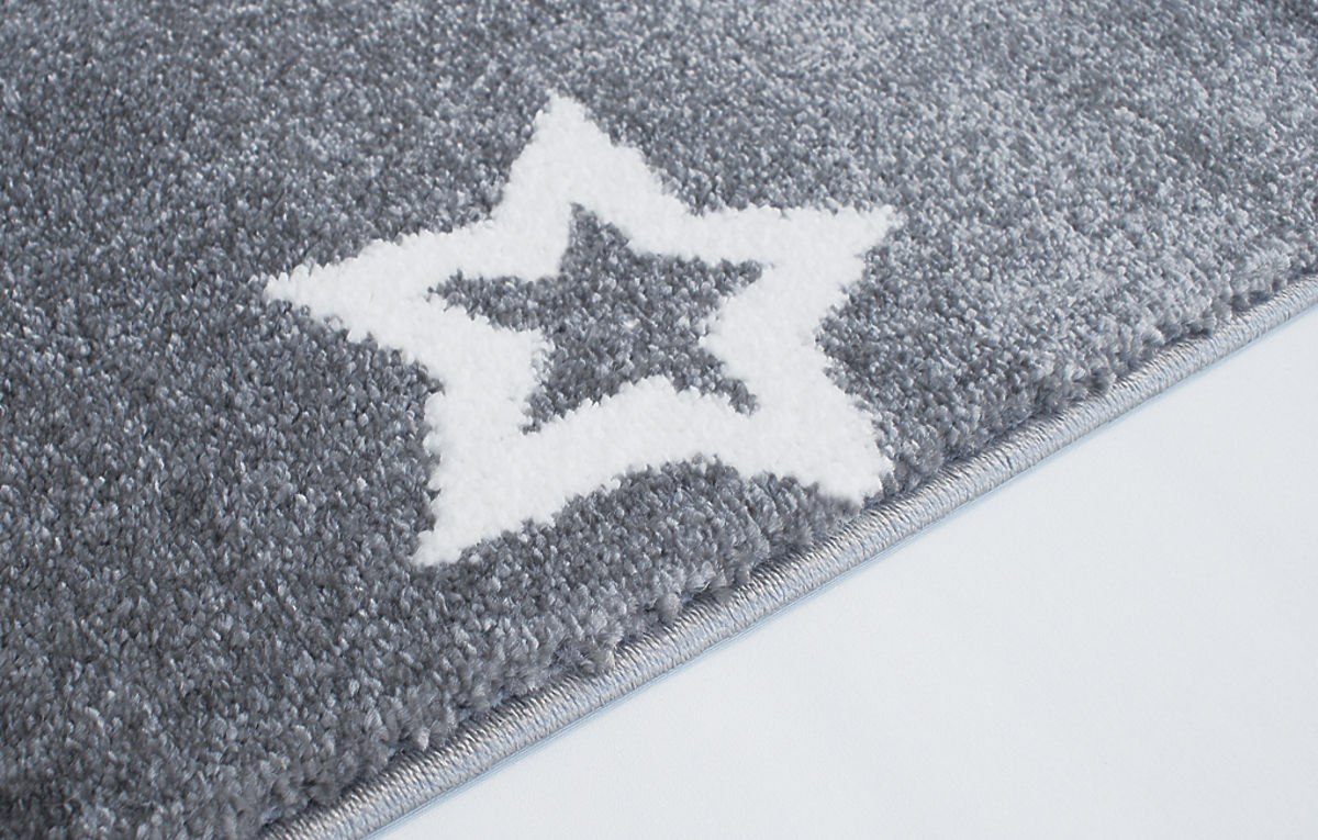 Podklad koberce je v příjemné šedé barvě, kterou doplňují jemné bílé hvězdičky v různých velikostech. Dětský koberec se vyrábí ze 100% polypropylenu, je na dotek velmi příjemný, jemný a hebký.