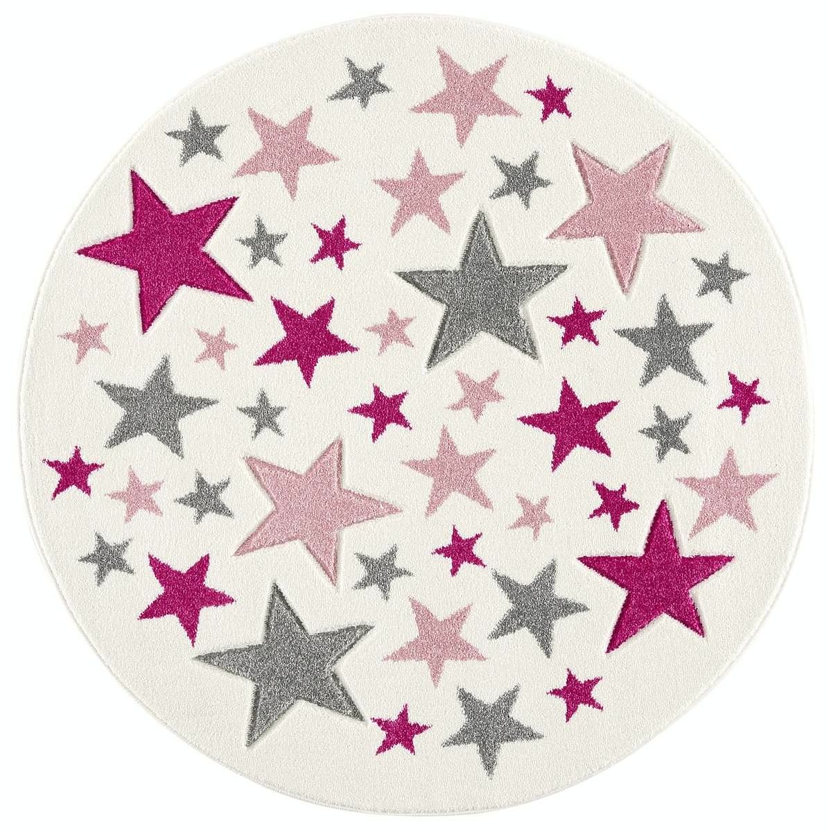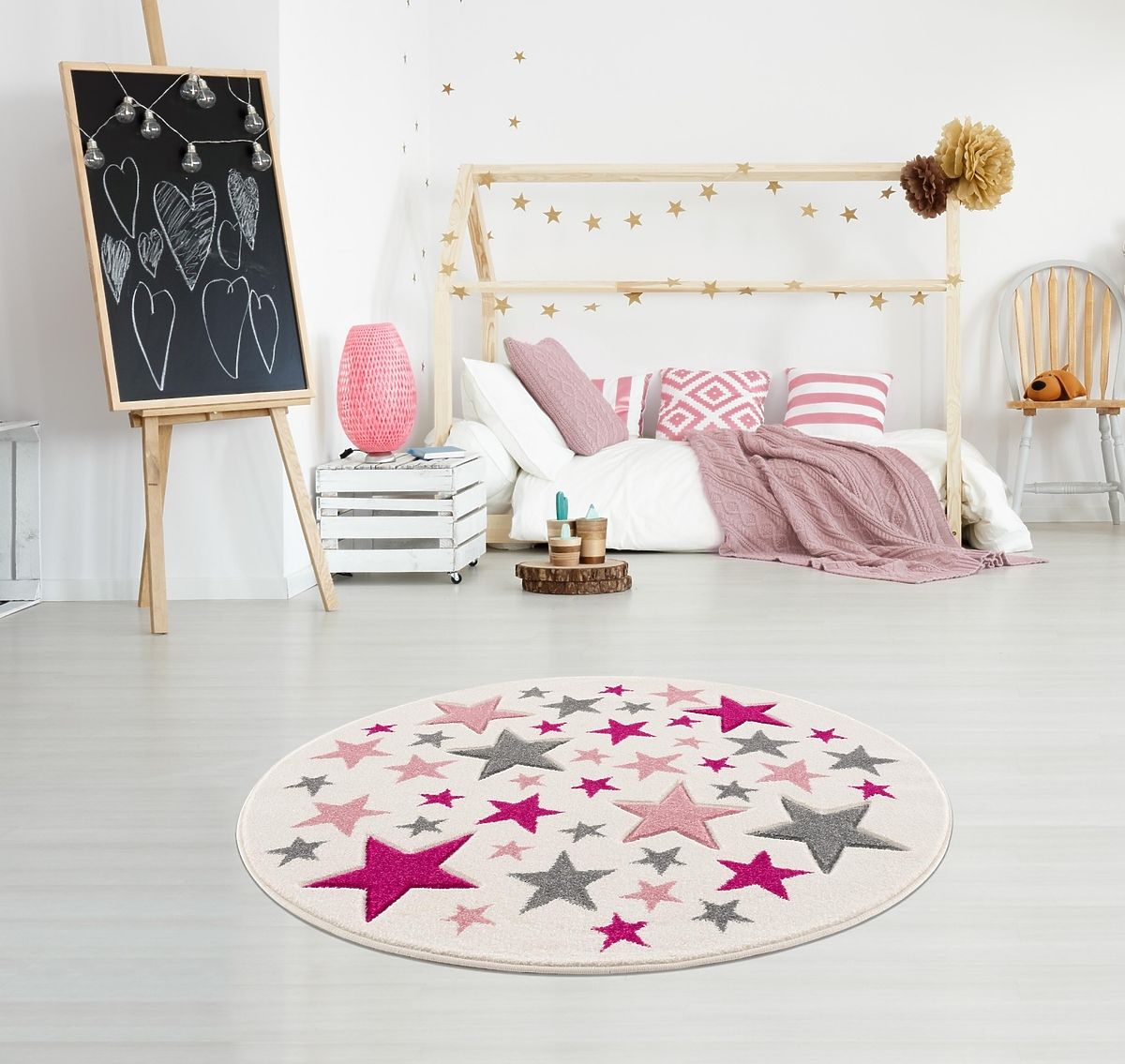 Luxusní kulatý krémový koberec s růžovými a šedými hvězdami od německé společnosti LIVONE do dětského nebo studentského pokoje pro holky.