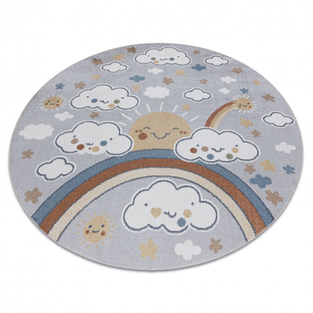 Okrugli tepih s motivom oblaka i neba u svijetlosivoj i krem boji. .. više