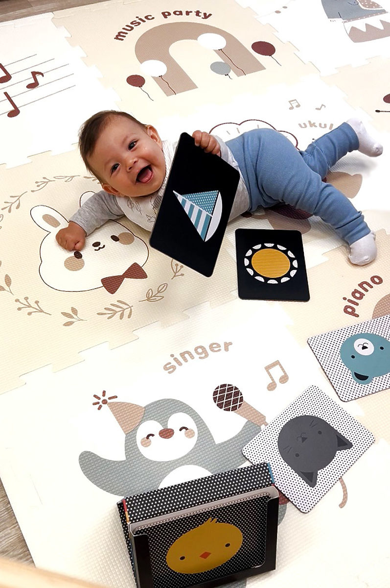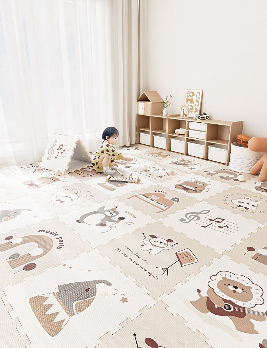 Pjenasta podloga za igru sastoji se od 9 kvadrata koji se lako spajaju u praktičnu i udobnu površinu za igru veličine 180x180 cm. Podloga je izrađena od mekog i sigurnog materijala koji djeci pruža udobnost i zaštitu tijekom kretanja po podu. Na pojedinim dijelovima nalaze se simpatične životinje stilizirane kao glazbenici, okružene motivima glazbe i notama, što potiče dječju maštu i radost otkrivanja. Podloga je idealna za kućnu upotrebu i pomaže u razvoju osjetilne percepcije i kreativnosti. Kombinacija prirodnih tonova s bijelom bojom, zajedno s kvalitetnom izradom, čini ovu podlogu lijepim dodatkom svake dječje sobe ili igraonice. Glavne značajke: 9 kvadrata, mekani i sigurni pjenasti materijal, lako spajanje dijelova, motiv glazbe i životinja kao glazbenika, potiče osjetilnu percepciju i kreativnost, pogodno za djecu od 6 mjeseci.