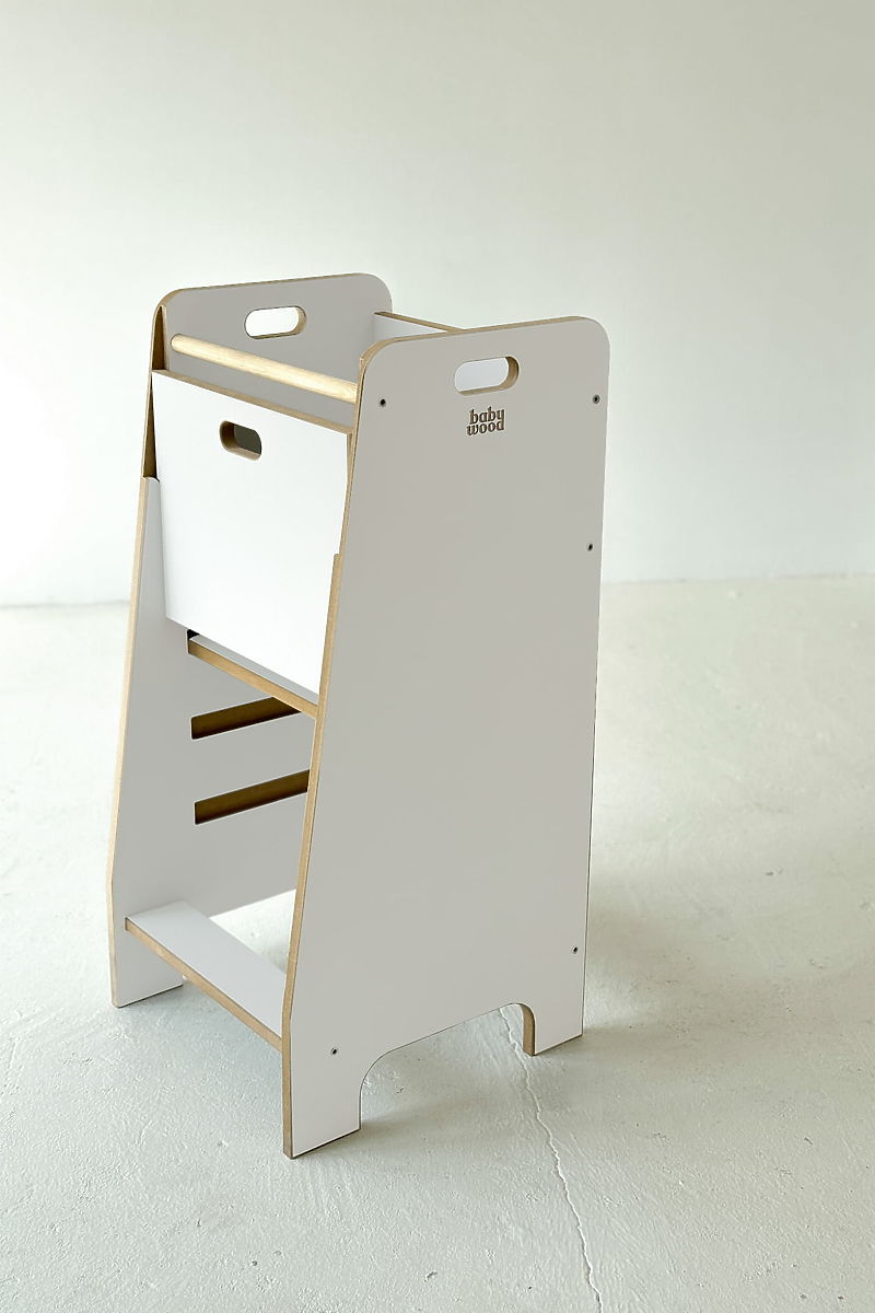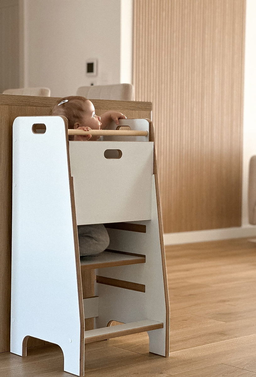 Kuhinjski Pomagač Comfort je pametan kuhinjski pomagač koji omogućuje djeci da se sigurno uključe u svakodnevne aktivnosti u kuhinji. Omogućuje im da stabilno stoje na odgovarajućoj visini i aktivno sudjeluju u pripremi obroka, dok roditelji mogu biti sigurni da je sve sigurno i pod kontrolom. Svojim čistim dizajnom uklapa se u moderne i klasične kuhinje. Ovaj pomagač nudi djetetu prostor ne samo za pomoć pri kuhanju, već i za istraživanje, učenje i zajedničko provođenje vremena. Podržava samostalnost i prirodni razvoj vještina od rane dobi.