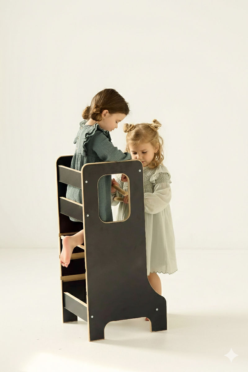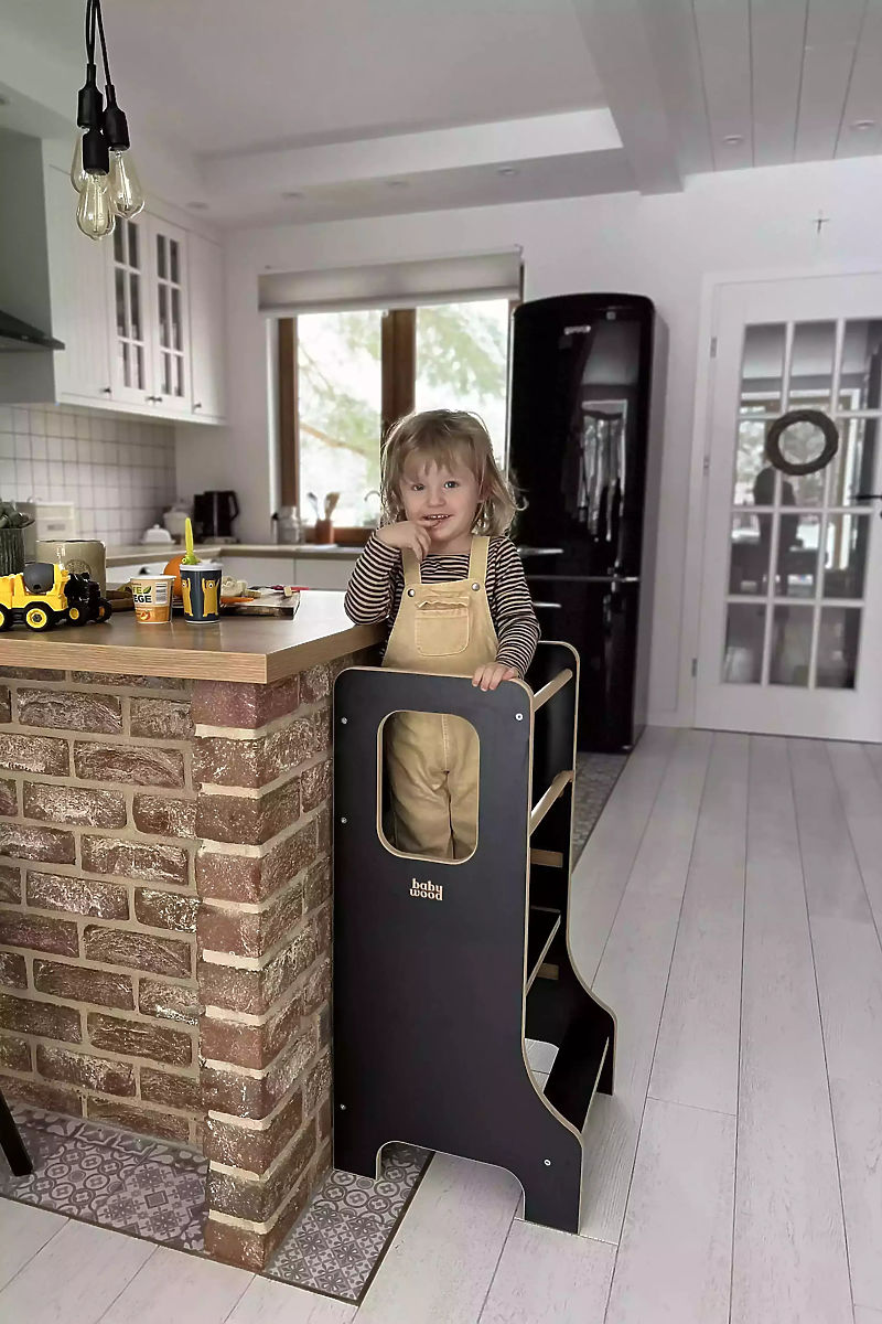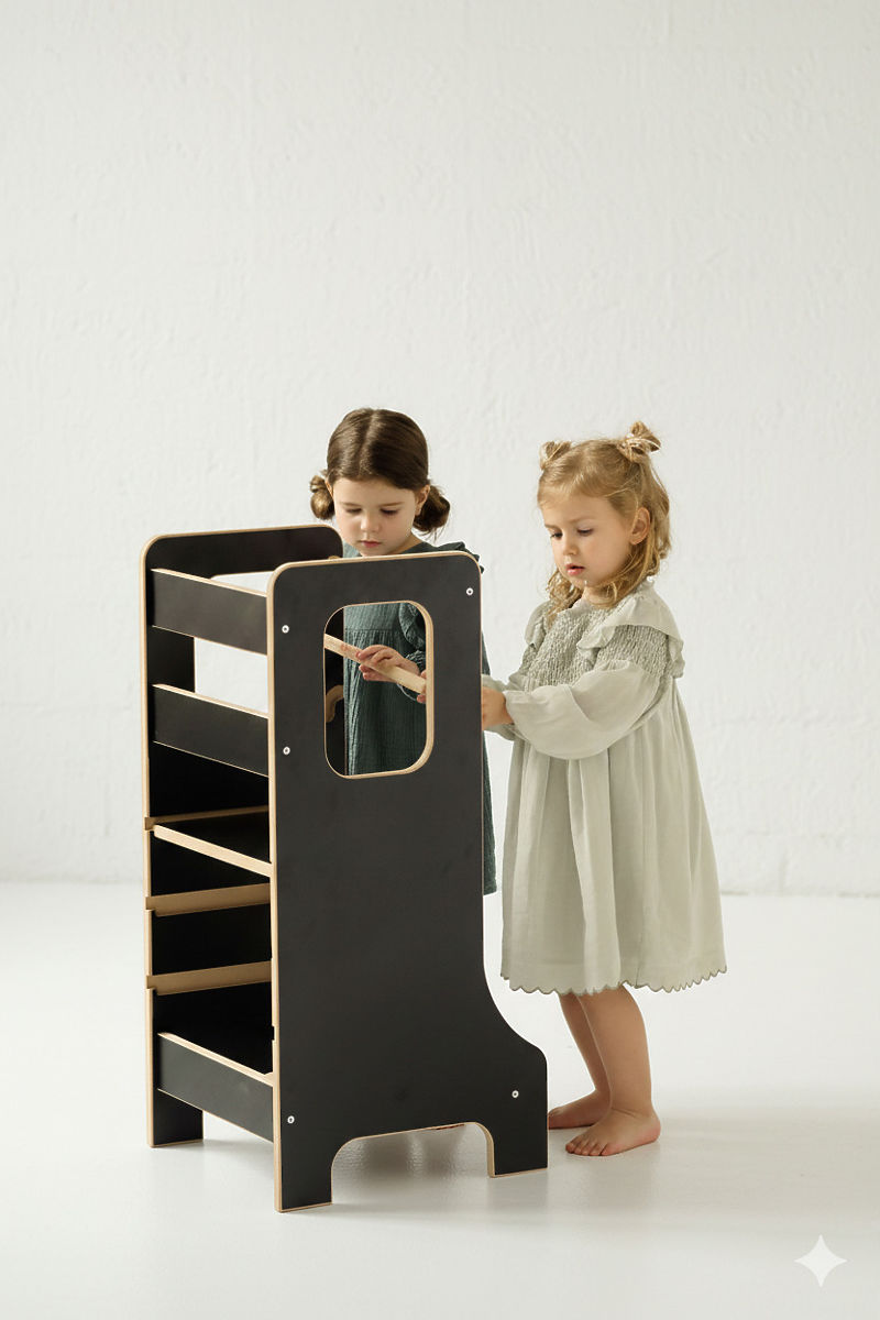 Učionica toranj SLIM u crnoj izvedbi je stilski i praktičan pomoćnik za obitelji koje žele djecu sigurno uključiti u svakodnevne kućanske aktivnosti. Omogućuje djeci da stoje na pravoj visini, promatraju događaje oko sebe i aktivno sudjeluju u uobičajenim aktivnostima. Istovremeno podržava razvoj samostalnosti, motorike i samopouzdanja djeteta. Zahvaljujući vitkom dizajnu, toranj se lako uklapa u moderne interijere i ne zauzima nepotrebno mnogo prostora. Stabilna konstrukcija i promišljeni sigurnosni elementi osiguravaju udobno i sigurno korištenje.
