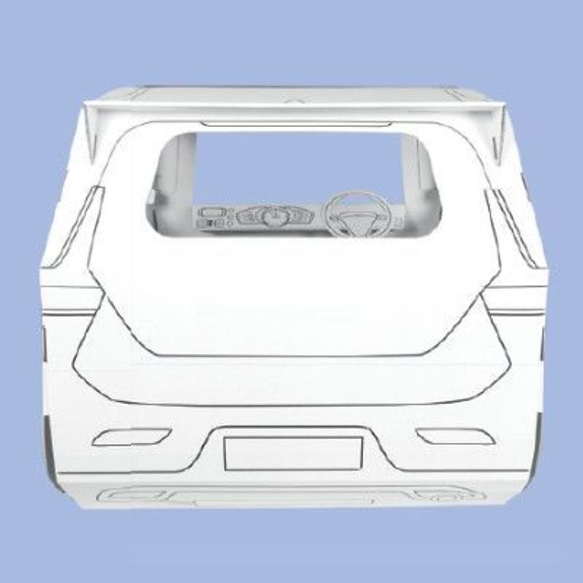 Vanzemaljski automobil od kartona u prirodnoj veličini. Igračka ima vrata koja se otvaraju. Otisak auta u originalnom obliku je crno-bijeli i stoga se dizajn boja temelji na mašti djeteta i njegovih najmilijih.