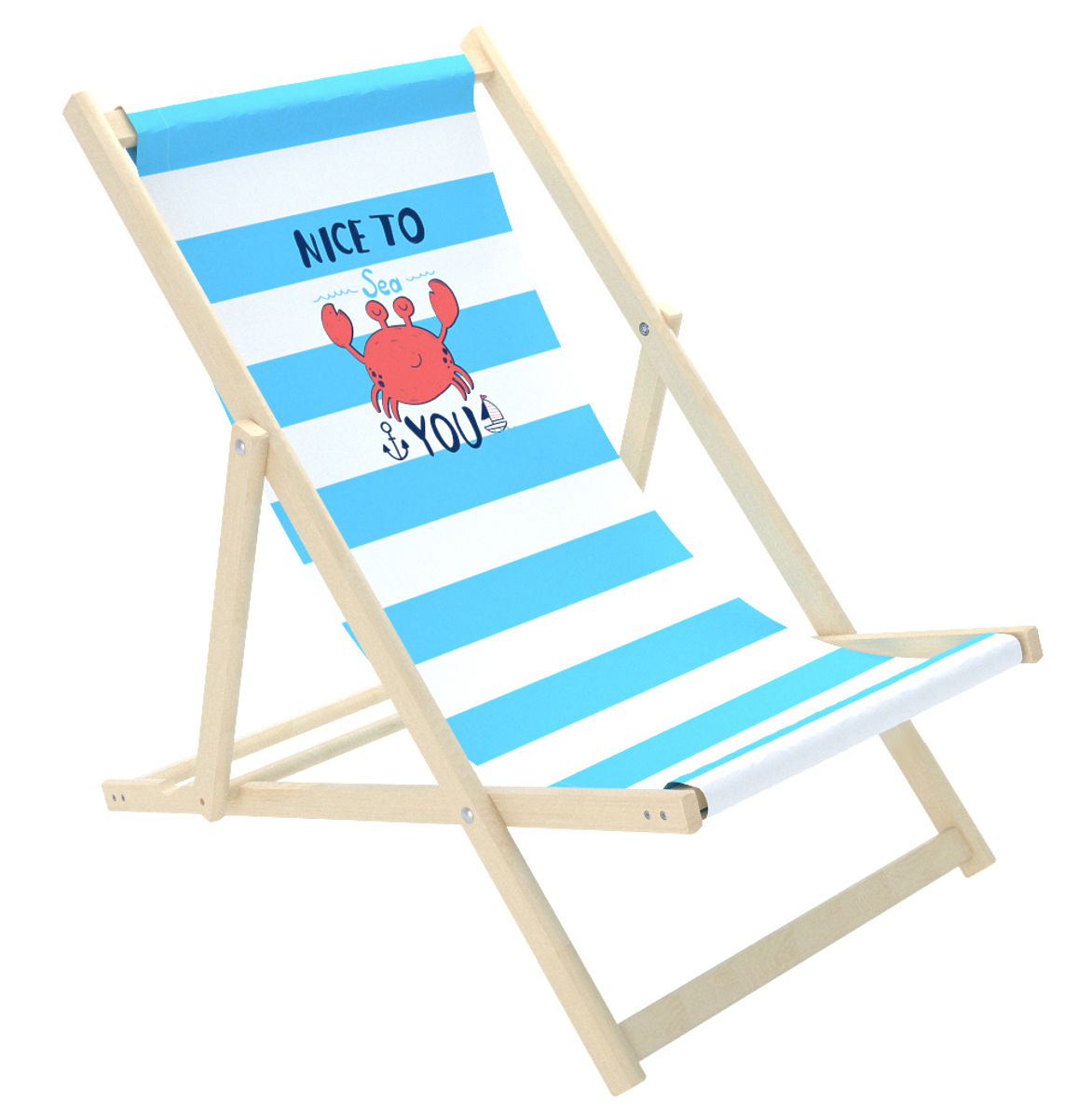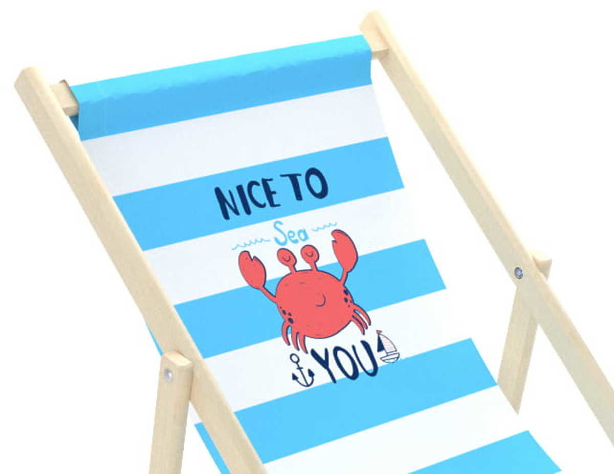 Prekrasna ležaljka za plažu s veselim kutijastim uzorkom na plavo-bijeloj tkanini. Ležaljka je ukrašena šaljivim engleskim natpisom NICE TO SEA YOU . Neka se djeca opuste na suncu. Dječja ležaljka za plažu izvrsna je alternativa vrtnoj stolici ili fotelji.